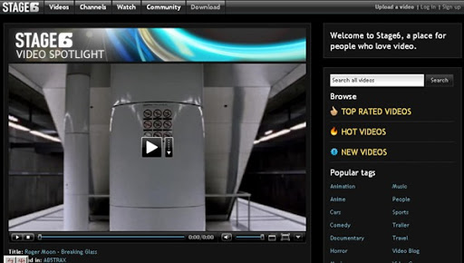 stage6的首頁如上,可以注意到在右上角可以搜尋,可以LOGIN帳戶,將影片加入最愛,留言等等,功能與YOUTUBE相當類似。不過注意他的影片畫面正中央,除了一個播放扭之外,旁邊有個狹長的箭頭往下,猜猜是什麼意思?答案是下載,不像YOUTUBE想下載需要開外掛,而且下載的檔案往往還要轉檔才能播放,stage6這點相當大方,如果不怕塞爆硬碟的話,影片隨你抓啦!